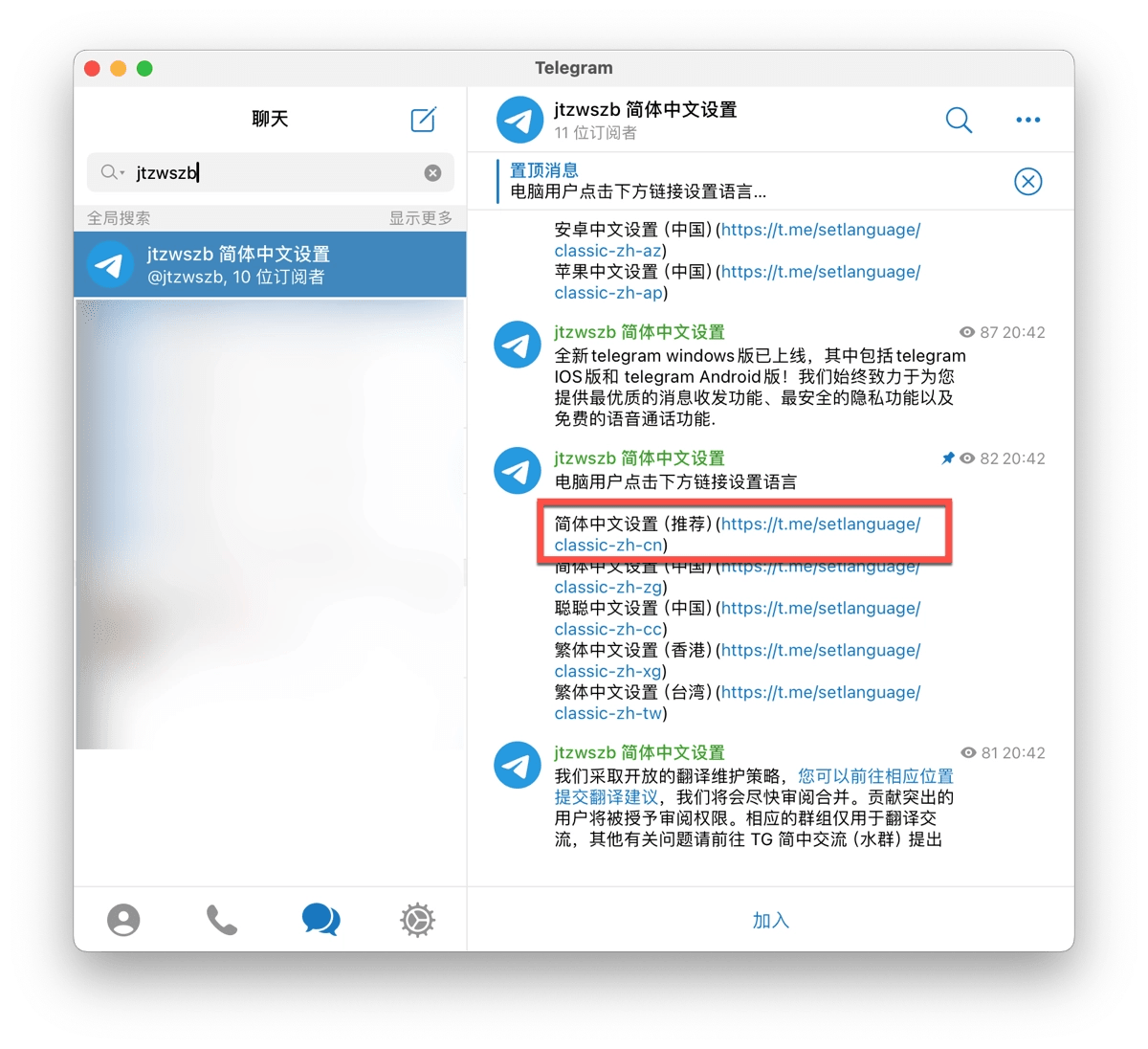 - 进入“简体中文设置包”频道后,您会看到频道中提供了简体中文的语言包。如果您是在Windows电脑上使用Telegram,可点击任意一条需要的翻译设置,比如选择第一条简体中文设置(推荐);点击语言包链接根据屏幕指示操作即可将Telegram界面语言更改为简体中文。
