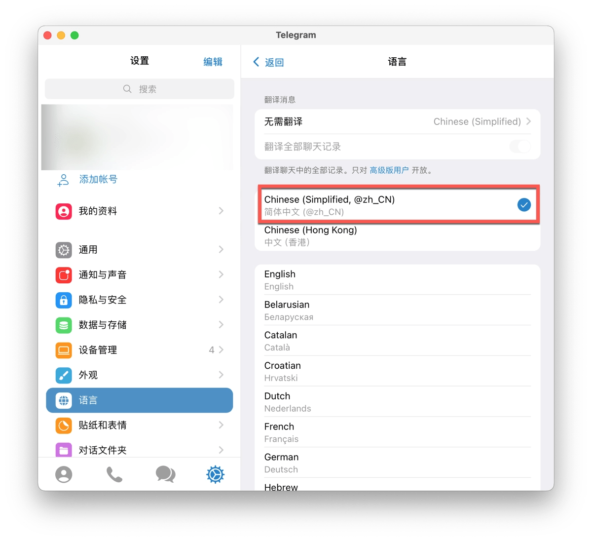- 应用语言包后,返回Telegram主界面。