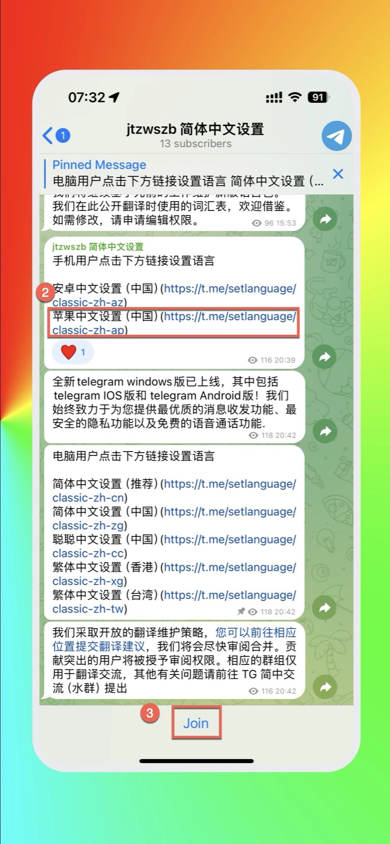 - 点击屏幕底部的Join加入频道,在频道内找到针对苹果设备的中文设置语言包链接;