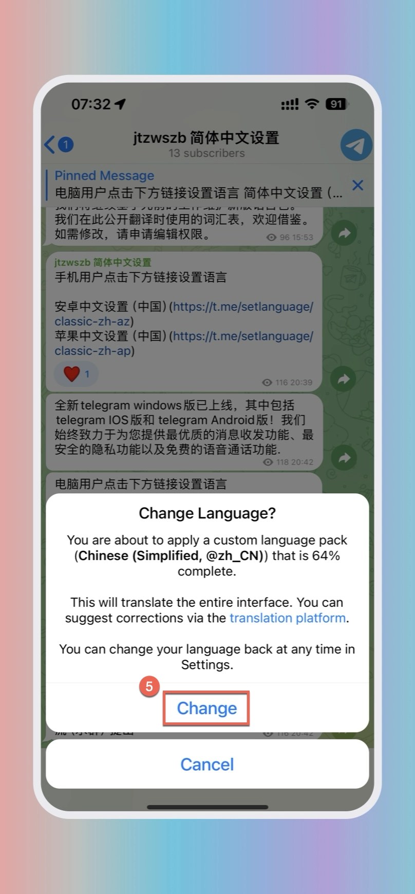 - 点击相应的语言包链接,在屏幕底部弹出的窗口中点击Change即可更换Telegram app界面语言为中文。