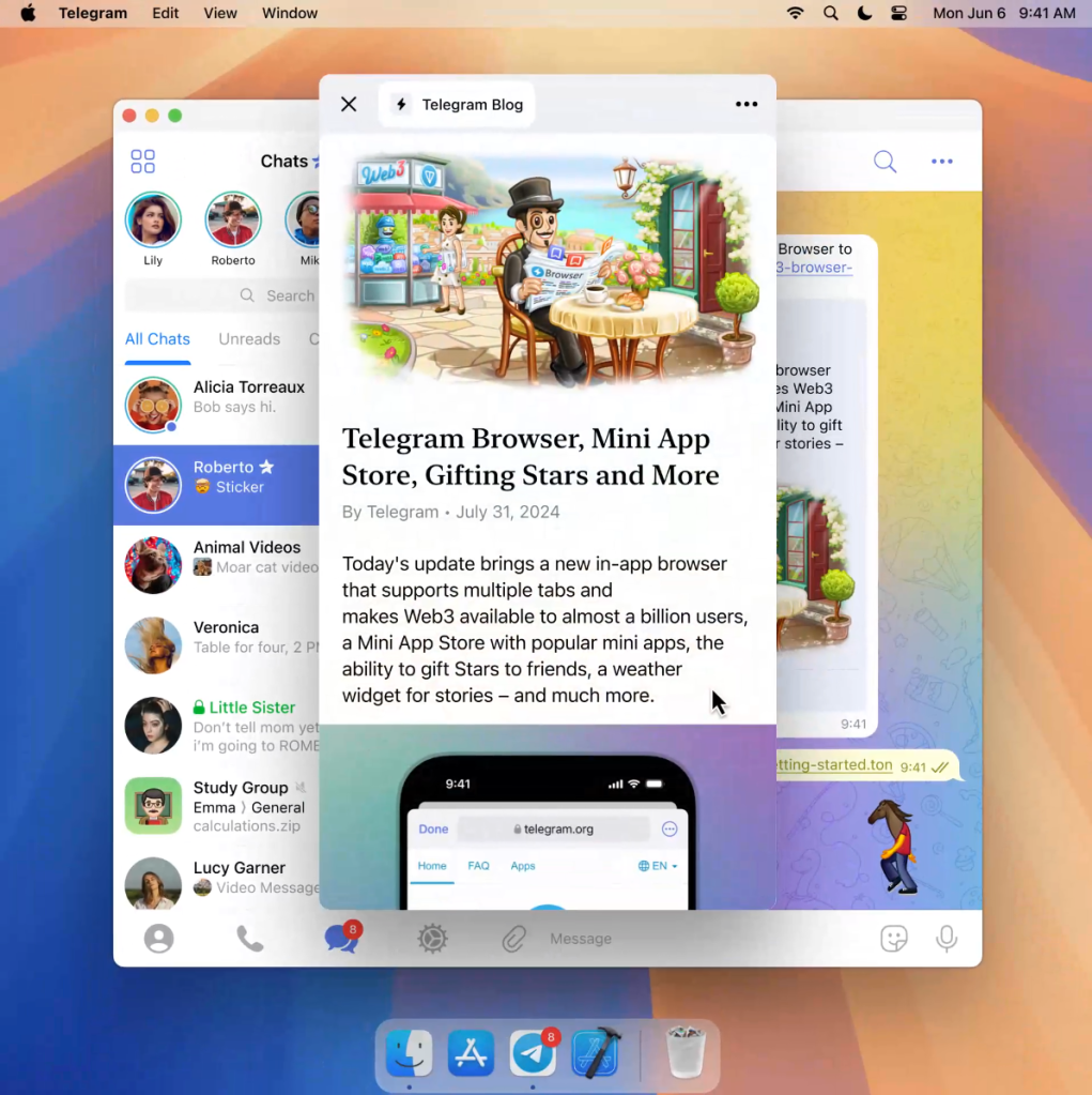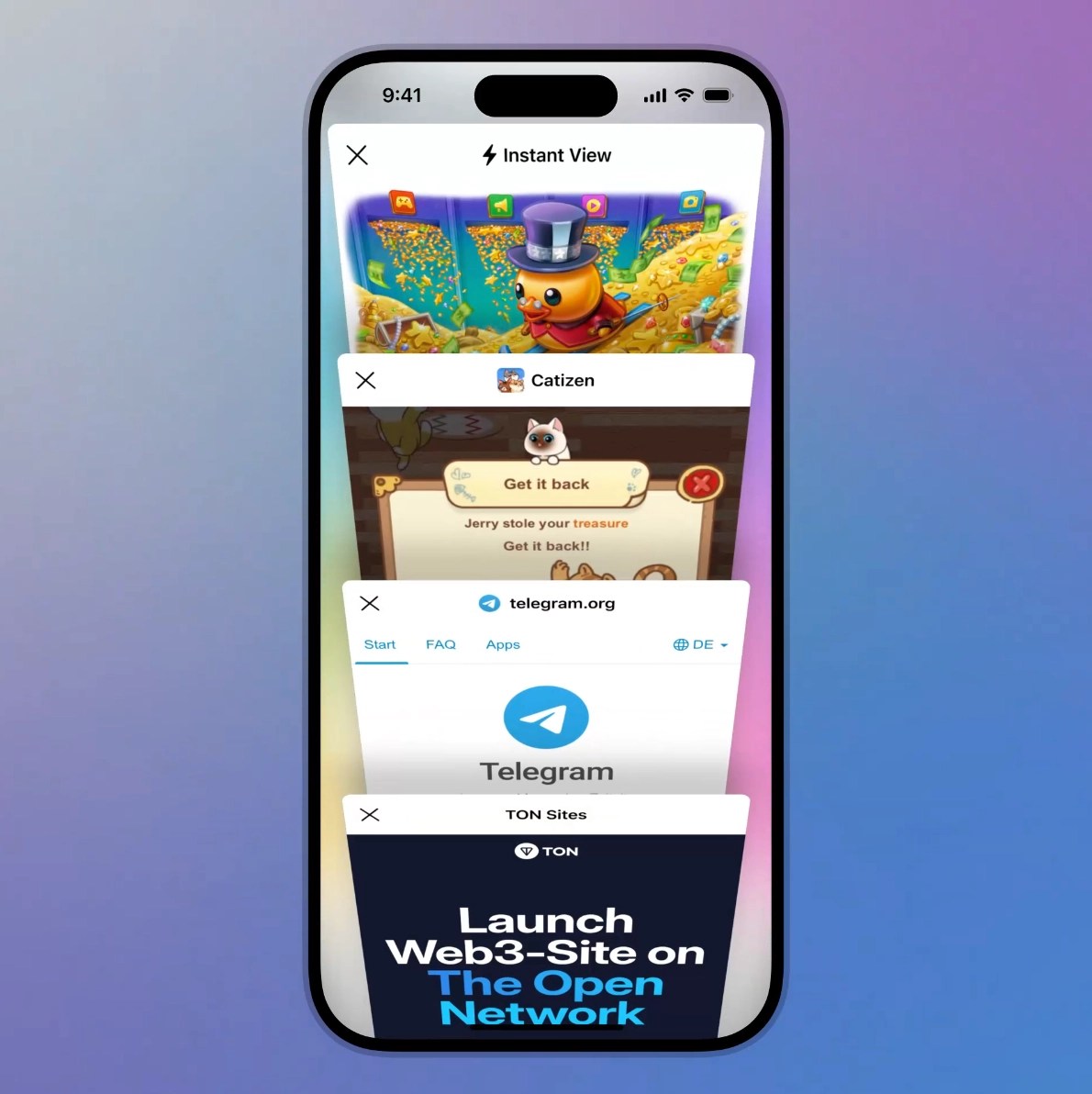 今天的更新带来了一个新的应用内浏览器,它支持多个选项卡并让近十亿用户可以使用Web3,一个迷你应用商店,一种新型迷你应用,可以向朋友赠送Telegram星星——等等。