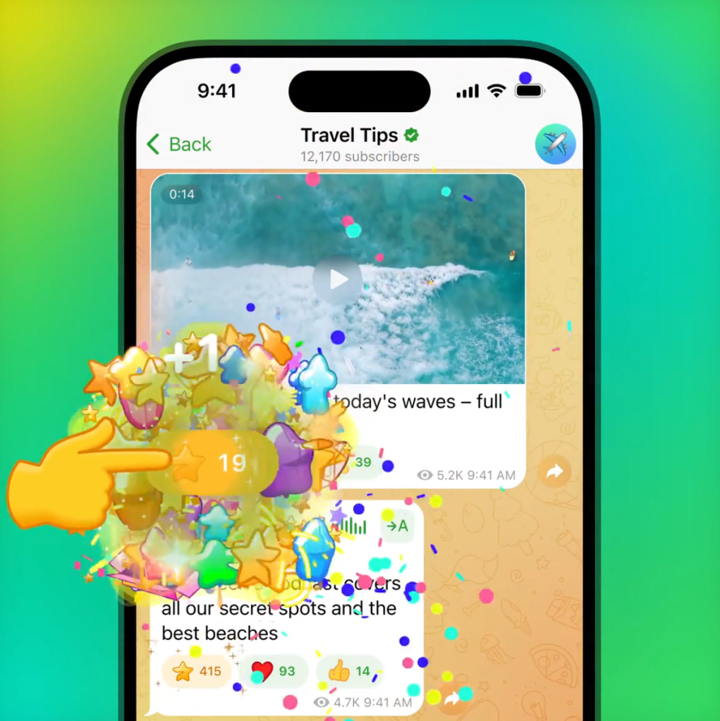 用户现在可以通过使用新的星星反应向他们发送Telegram Stars来直接支持他们最喜欢的频道和内容创建者。